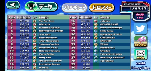 なお、このチャートは無課金で進めたものなので、最初から多くの曲が選べるAC版や、課金した場合はもうちょっと楽に到達できるかな?って気はします。(空白2曲分+Naze Otoge Hajimatta?、1st Tutrial枠が空いてますね)